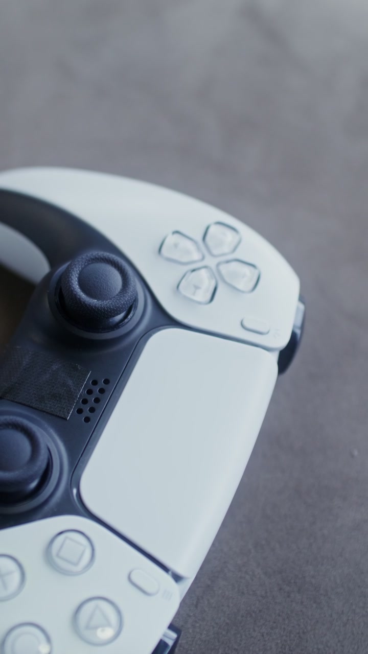 A close-up vertical shot pans across a white PlayStation 5 DualSense game controller lying on a grey textile surface.
